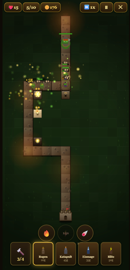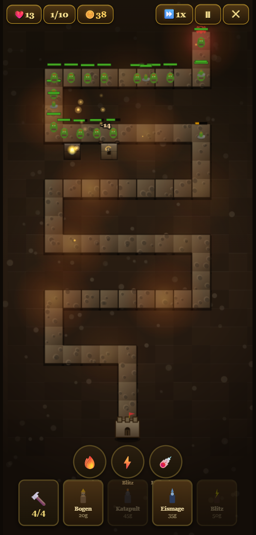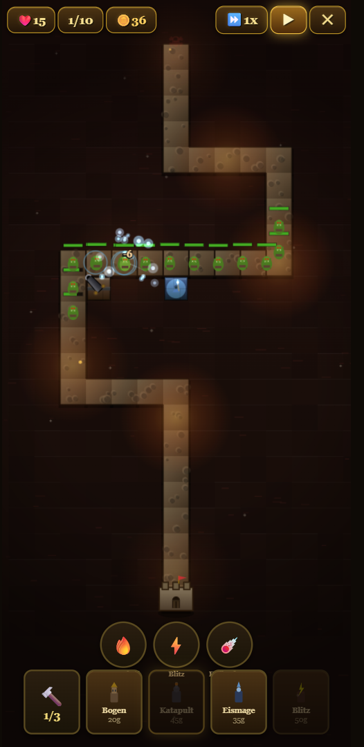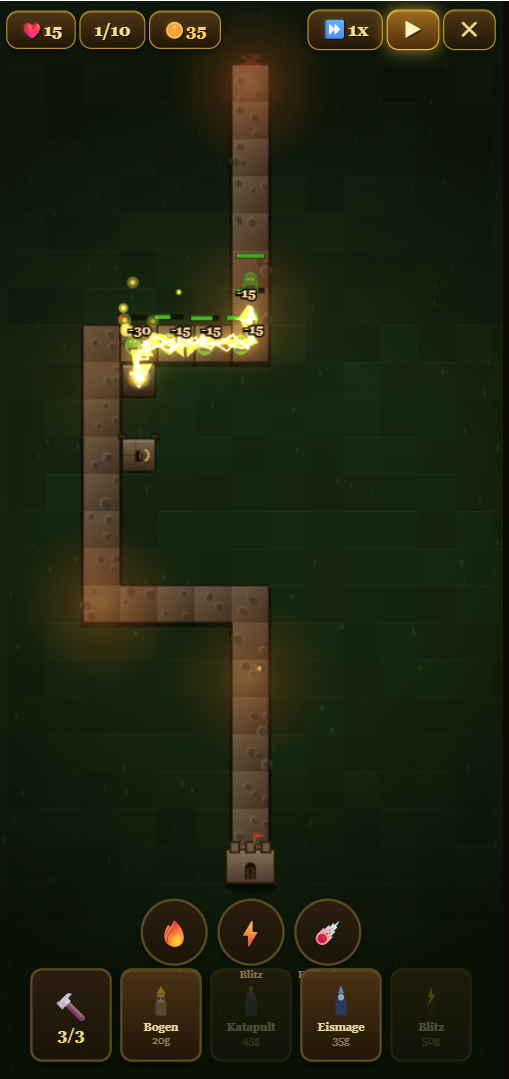 Jeder besiegte Gegner zahlt. Investiere in Türme oder spare auf den Blitz.