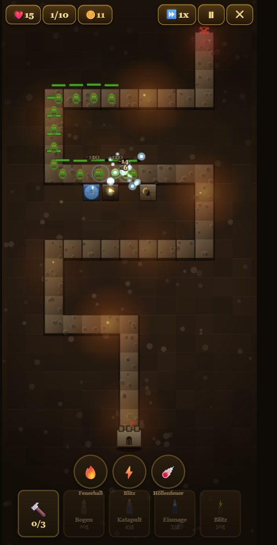 Taktisches Tower Defense in einer mittelalterlichen Welt. Baue vier Turmtypen, wirke drei Zauber, halte über zehn Wellen stand — im Browser, ohne Download.